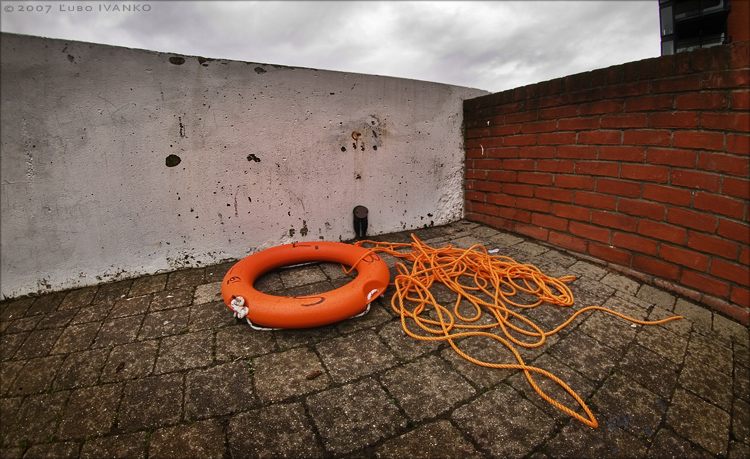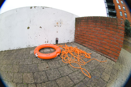 Táto fotografia nezachytáva asi nič výnimočné. Je to záchranné koleso pohodené kdesi nabrehu Temže v Southwarku, ale - proste sa mi veľmi páči tá široká (8mm) perspektíva, čo sa dá dosiahnuť s Pelengom...
