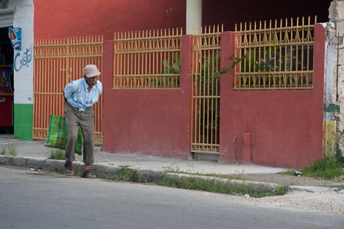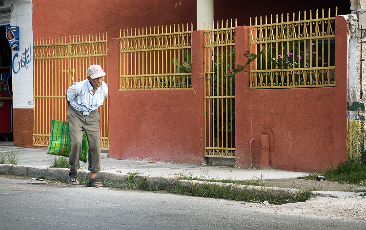 Niekedy to proste nefunguje tak "podľa príručiek". Pekná červená budova, troška trávy pekne kontrastuje - keby tam len chcela prísť nejaká zelená vec či postava. A tu ho máme - ešte lepšie, starý zhrbený mexičan so zelenou taškou. Starí a chorí ľudia - to vždy vyzerá na foto dobre...
