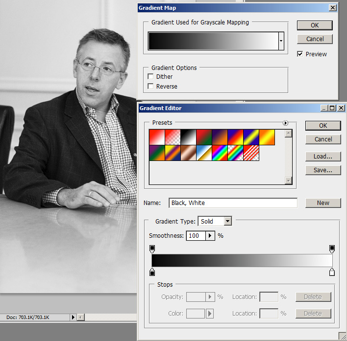 Prevod do čiernobielej za 30 sekúnd :) Niekedy čiernobiela vynikne lepšie a najmä - ak nechám prevod do ČB na tlačiareň (alebo asistentku) tak to bude určite šedé... Tajomstvo prevodu na jeden klik sa volá Gradient Map. Image, Adjustments, Gradient Map, vybrať ten obyčajný čierna/biela a je to. Občas (najmä keď má fotografovaný čierne sako, čo je medzi šéfmi a manažérmi skoro vždy) sa oplatí predtým trošku presvetliť tiene (Image, Adjustments, Shadows/Highlights) a urobiť gradient map až potom. Nakoniec je to však aj tak iba Save As, "zmensene na web cb.jpg", ďalší prosím.