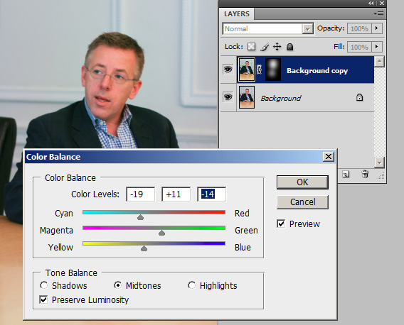 Ďalší krok je Adjust Skin Tone, resp. vyvážiť farbu pleti. Neviem či mám zvláštne nastavený fotoaparát, alebo monitor ale stále sa mi pleť zdá akási veľmi ružová resp. červená. Nová vrstva (kópia predošlých), Image, Adjustments, Color balance pridať Cyan, Green a Yellow, pridať masku, namaskovať iba na tvár, rozblurovať masku (v CS4 už je na to slider - Feather), znížiť opacity aby to bolo uveriteľné zlúčiť vrstvy a šup na ďalší krok.
