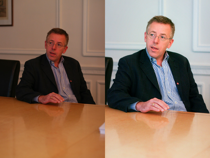 No fajn - čakal, som že keď budem fotiť s 50kou (crop factor 1.6 čiže vlastne 80mm) na 1/40 a iso 640 tak to nebude nič moc. Bol však už večer a bez umelého svetla sa nedalo. Nechcel som však ostré tiene tak som svetlo stlmil na minimum. Výsledkom je pomiešané denné svetlo a asi 3 druhy žiariviek a halogénových žiaroviek v našej konferenčnej miestnosti. Alebo jednoducho - nesprávne vyvážená biela. Osobne by som takúto foto asi zmazal už vo fotoaparáte, no z tejto mám teraz spraviť prezentačný portrét ako sa patrí. Poďme na to. Alebo ako vraví tá moja asistentka "Lubo will do his magic now..."