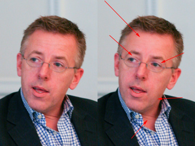 Tento krok je celkom nepríjemný a zdĺhavý a nie je to vďačná práca, lebo výsledok je minimálne viditeľný (a preto som ho zvýraznil šípkami :). Niektorí ľudia dokonca potrebujú zúžiť tvár, bradu, nos... Na to treba filter Liquify a ďalších pár sekúnd. Ach jo. Každopádne 90 sekúnd je na takúto retuš až až.
