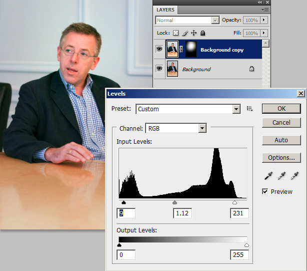 Light up Head (Lumino?) - tým som chcel povedať, že - zosvetliť hlavu (lebo tvár je hlavný objekt) a ak sa pokazia farby tak zmeniť krytie na Luminosity. V Photoshope to znamená - Nová vrstva, Image, Adjustments, Levels, pravý posuvník (biela) poriadne doľava, stredný posuvník (stredy/šedá) trošku doľava, a ľavý posuvník (čierna/tiene) trošku doprava kvôli kontrastu. Pridať masku, namaskovať iba na tvár a jej okolie, rozblurovať masku (stačí posunúť posuvník Feather doprava), ak je to príliš výrazné znížim opacity, ak sa príliš pomenili farby zmením krytie na Luminosity. Zlúčim vrstvy a ide sa ďalej.