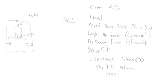 tá kresbička naľavo znázorňuje, ako si predstavujem orez (ak je to možné) stredom foto bude krk, nad hlavou je miesta "a" a po stranách má postava miesta "b", a je menšie ako b a režem to na 2:3 :) Takto pekne som si to naplánoval, ale - samozrejme v praxi sa to tak nedá - závisí od toho ako vyzerá originál foto. Ok - ešte predtým ako začnem rezať, si narovnám "horizont" - nijakú veľkú presnosť netreba, Ctrl A, Ctrl T, trošku zrotujem ak treba. C (crop) nastavený na pomer strán 2:3 klik. Neplatí žiadne také že dvakrát meraj a raz rež - nie je to umelecká foto treba rezať rýchlo - ešte ma čaká 15 ďalších :)