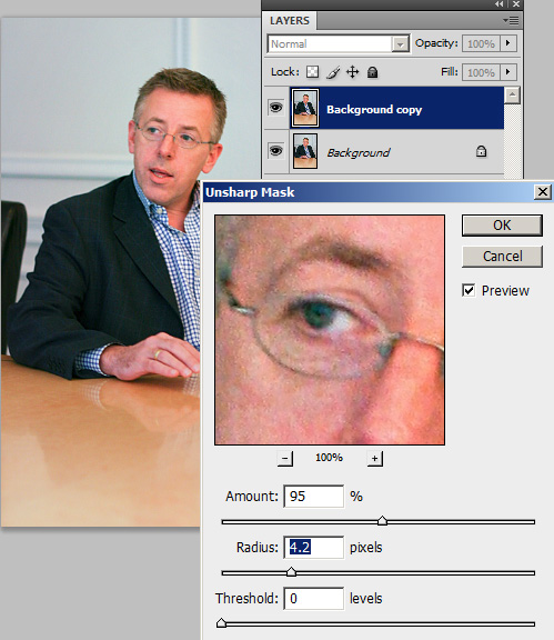 Presharpen face (if needed) - čo preložené z wrayovho slangu znamená - ak je foto veľmi (pohybom, malá hĺbka ostrosti) neostrá, tak aspoň na tvári doostriť - keď aj cez poriadne veľký polomer. Ono - keď sa to poriadne zmenší bude to vyzerať ok. Vo foto ktoré používam v tomto príklade je originál fakt poriadne neostrý a tak si zaslúži poriadnu dávku Unsharp Mask. Nedá mi však pozerať sa na ten šum a tak najprv venujem 10 sekúnd odšumovaciemu filtru. Filter, Noise, Reduce Noise. Mám tam parametre ešte z predošlých úprav, ale v podstate - hocijaké nastavenia sú lepšie ako ten šum čo tam je teraz. Potom už môžem naozaj skopírovať vrstvu, doostriť (netreba sa báť veľkého Amount ani Radius), pridať vrstve čiernu masku, namaskovať iba oči, ústa, možno trošku nos a vlasy, rozblurovať masku (Feather, feather... vynikajúca nová fíčurka v CS4), znížiť opacity, zlúčiť vrstvy, Save as "foto velka.jpg"