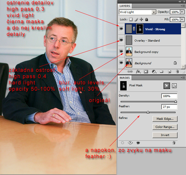 Ručne by to trvalo možno 2 minúty, s akciou 2 sekundy. Výsledkom je že mám doostrený obrázok, pričom v druhej vrstve (tá čo ma krytie Soft Light) si môžem doupravovať farby (ak pridávam opacity, viac cítiť to Auto Levels), ak sa mi zdá foto príliš ostrá, tak znížim opacity ostriacej vrstve (tá šedá čo má krytie Hard Light) a ak sa mi naopak zdá, že oči by sa oplatilo ešte doostriť, iba ich vymaskujem v najvyššej vrstve (tá šedá čo má krytie Vivid Light)