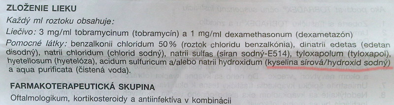 Také "milé" prekvapenie som zažil keď som si pozrel zloženie kvapiek čo som si celý týždeň po operácii kvapkal. Každý kto zvládol Chémiu pre 7my ročník vie že Kyselina sírová je poriadna sviňa a poleptá všetko živé a kyselina sírová a oko - tak to už vôbec nejde do kopy. Príp. ak nie kyselina sirová tak hydroxid sodný, ďalšia agresívna látka čo sa používa napr. na oddeľovanie mäsa od kostí :) (áno, áno viem že je to na reguláciu ph, ale aj tak keď vidím v očných kvapkách kyselinu sírovú nemám z toho najlepší pocit :)