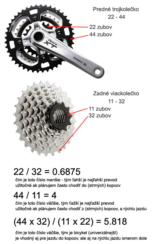 Prichádza na rad trocha matematiky. V špecifikáciách môjho bicykla si nájdem koľko zubov má predné koleso (cranks, crankset, prevodník...) a koľko zadné viackolečko (pastorok, freewheel...). Výrobcovia to udávajú pod rôznymi názvami, tak najlepšie bude hľadať parameter kde sú čísla ako napr. 28-48 (predné trojkolečko má obvykle približne takéto čísla) a 11-32 (zadné viackolečko). Uff. Ok