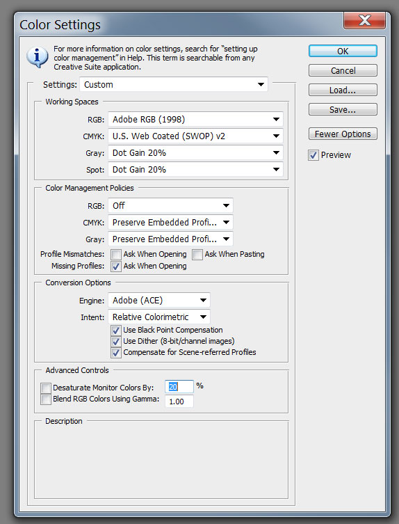 No a posledná vec – so všetkými obrázkami pracovať v Adobe RGB (mojom pracovnom režime). Nevadí, že obrázok je sRGB – hneď po otvorení ho skonvertujem do Adobe RGB (nič nepokazím, ak v Color Settings nastavím "Convert to working RGB" pre RGB súbory). Nezaujíma ma, aký profil mal pôvodný obrázok, ja pracujem v Adobe RGB. Keď skončím s úpravami, uložím zas obrázok v takom profile, ako uznám za vhodné.