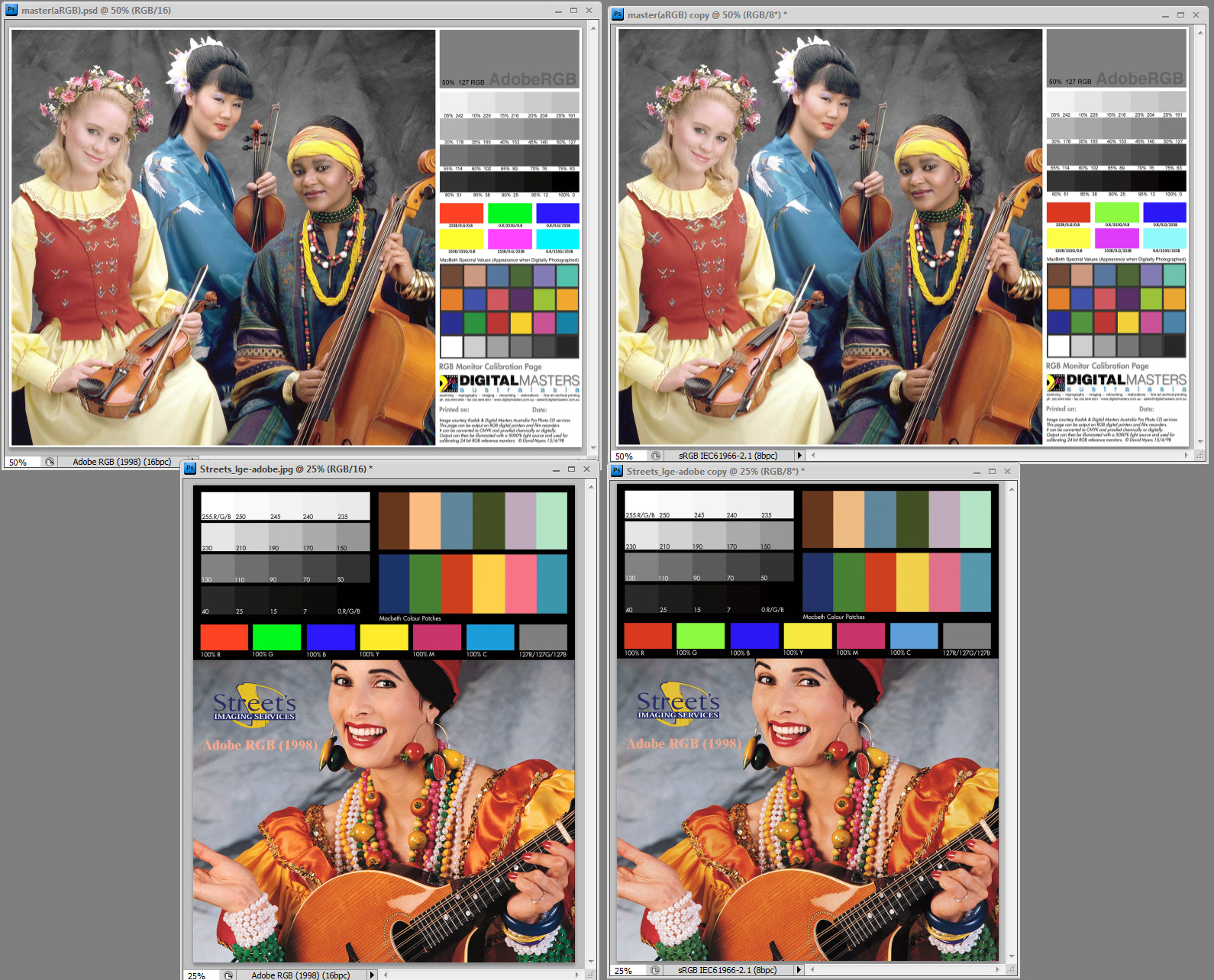 Otvorte ich oba vo Photoshope. Vyzerajú farebne rovnako? (Až na to, že ten Adobe RGB má trošku sýtejšiu červenú a zelenú? – mám na mysli tú testovaciu červenú napravo, čo sa týka tvárí – rozdiel v sýtosti farieb by mal byť len minimálny!) Výborne, Photoshop je nastavený správne.