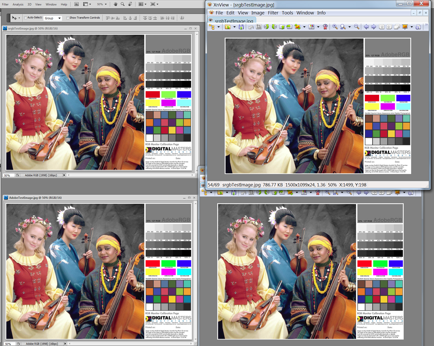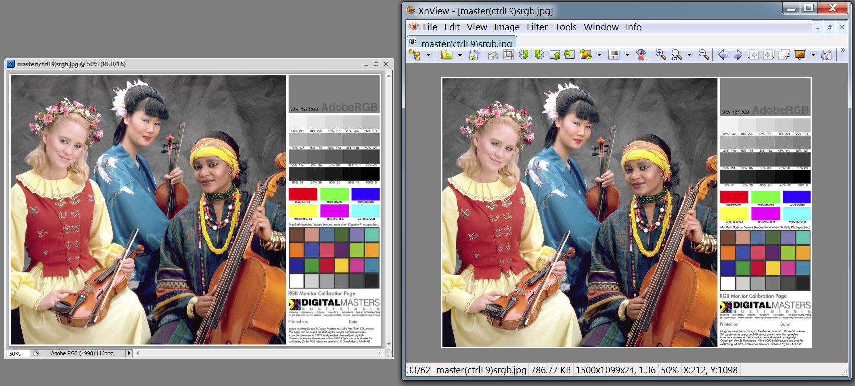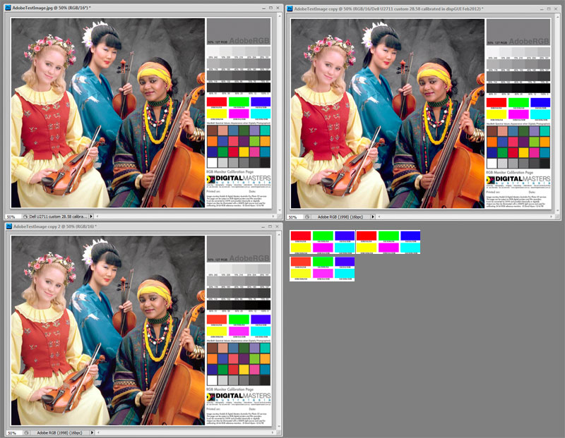 Teraz ich otvorte vo vašom prehliadači obrázkov. Je výsledok rovnaký ako vo Photoshope? (Teda oba obrázky majú rovnakú sýtosť farieb, akurát ten Adobe RGB má trošku sýtejšiu testovaciu červenú a zelenú.) Výborne, gratulujem, všetko je nastavené správne!