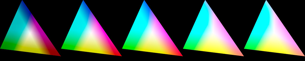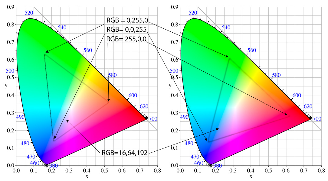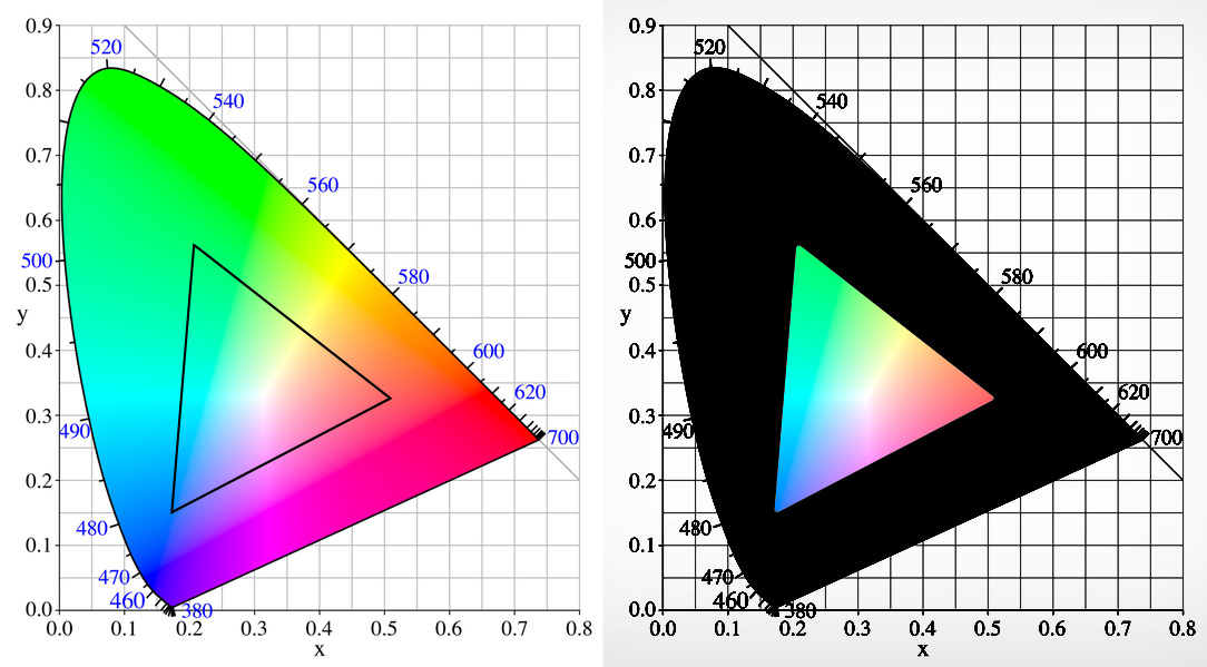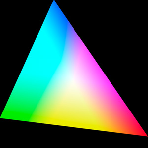 V každom rohu trojuholníka je jedna zo základných farieb. Toto je však zobrazenie gamutu iba pri jednej úrovni jasu. Gamut by mal byť v skutočnosti zobrazený trojrozmerne. Na osi z by sa nachádzala svetlosť.