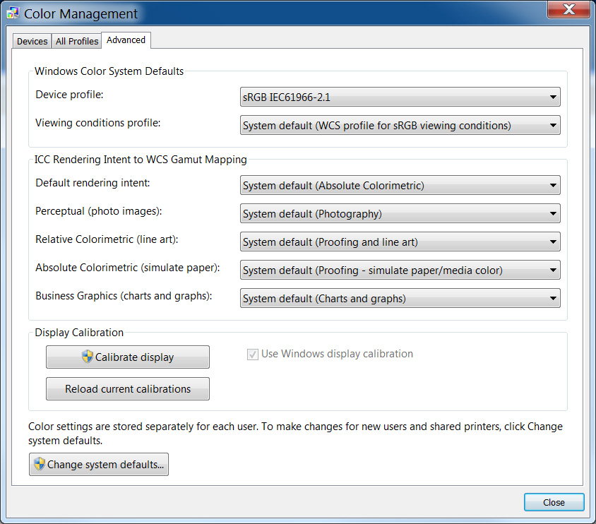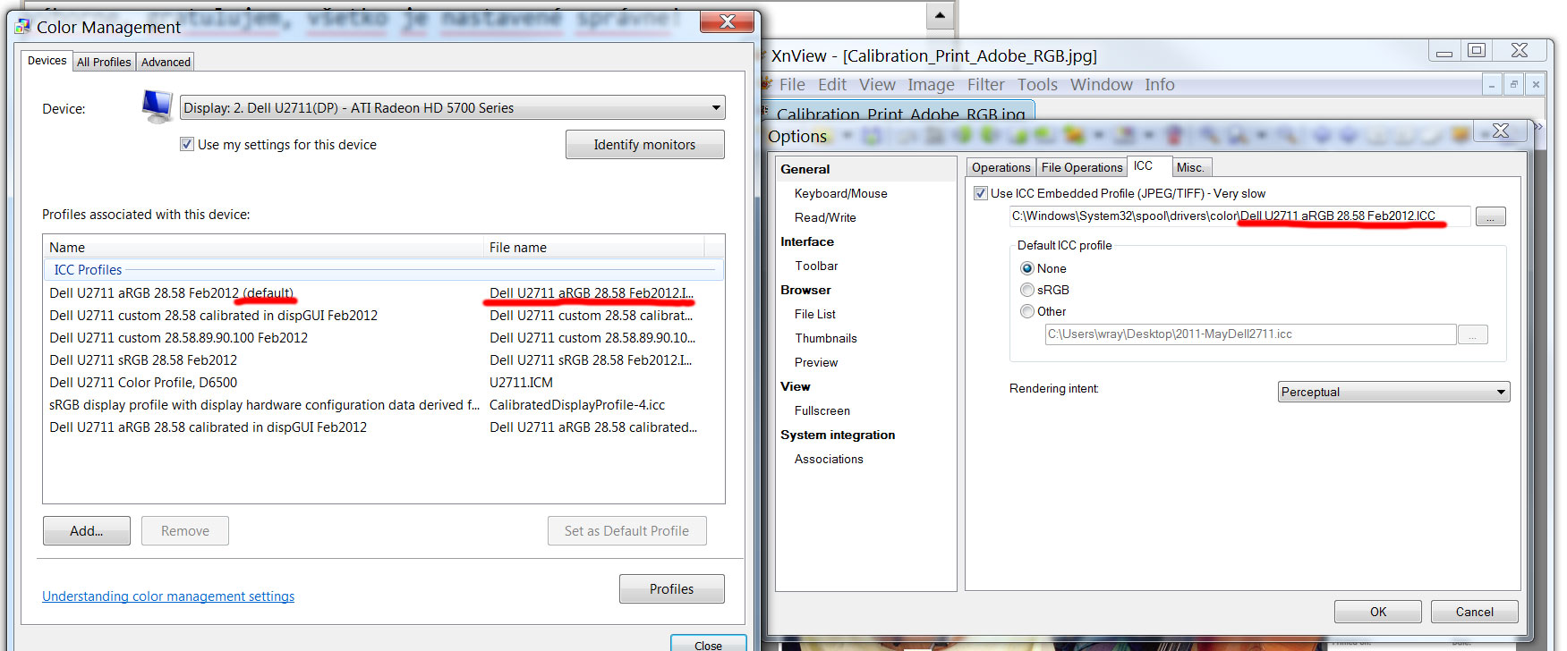 Nie je veľmi o čom rozmýšľať – skalibroval som monitor, tak využijem kalibračný profil. Preto som to predsa robil. Pripomeniem snáď iba – pozor na to, ak používam monitory dva (resp. viac), pre každý je nutné vybrať príslušný ICC profil (Windows 7 toto dovoľuje, snáď aj iné operačné systémy). Farebný profil sa nastavuje v Control Panel/Color Management a je nutné zaškrtnúť "Use my settings for this device".