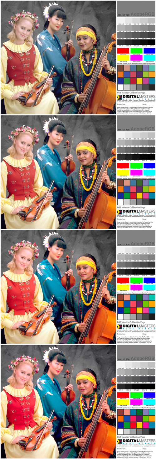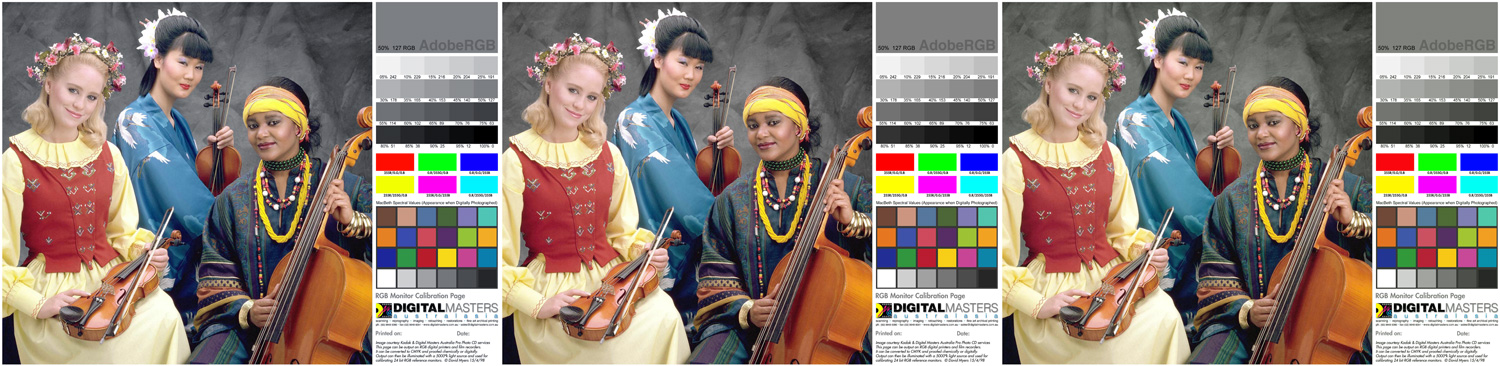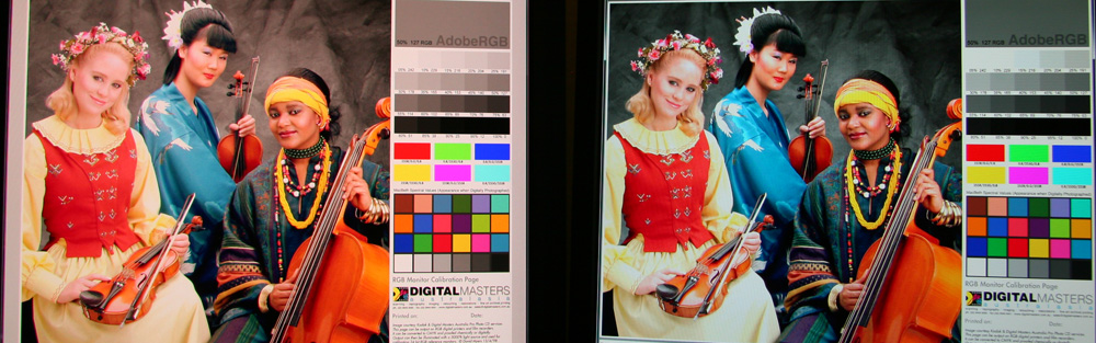Hore tak, ako to zachytil fotoaparát (fotené v Adobe RGB, pochopiteľne...). Farby sú skreslené (fotoaparátom), no o to nejde – dôležité je porovnanie obrázkov vľavo a vpravo. Dole screenshot z obrazovky. Je veľká šanca, že tento obrázok pozeráte v prehliadači, ktorý všetko zobrazuje ako sRGB, tak – ide len o porovnanie obrázku vpravo a vľavo. Vidíte rozdiel? A aj na tých slečnách, či iba v testovacích farbách? Správne! Pri takej "bežnej" fotografii je úplne jedno, či pracujem v sRGB alebo Adobe RGB – rozdiel bude prakticky nepoznateľný.