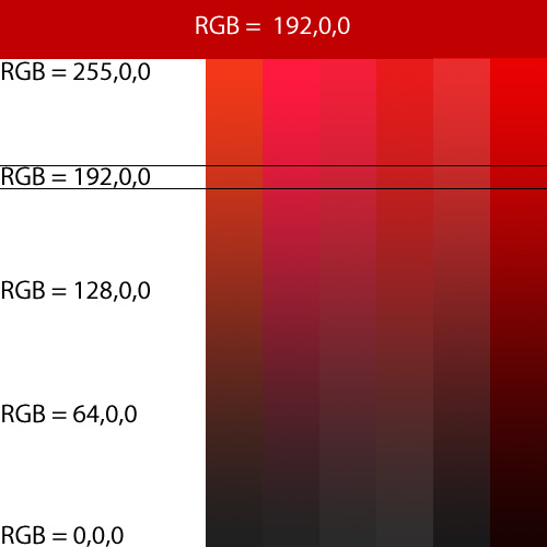 Ja vidím farbu RGB=192,0,0 tak, ako v hornom páse. Avšak na iných monitoroch môže vyzerať tak, ako jedna z farieb v zvislých pásoch. Dôvodom je, že každý monitor zobrazí maximálnu červenú (RGB=255,0,0) len tak dobre, ako vie, a rovnako čierna (RGB=0,0,0) je len taká čierna, ako dovoľujú možnosti monitora. Aby to nebolo dosť - farby sú ovplyvnené aj tým, ako si kto nastavil svoj monitor (niekto má rád väčší kontrast, iný preferuje napr. teplejšie farby).
